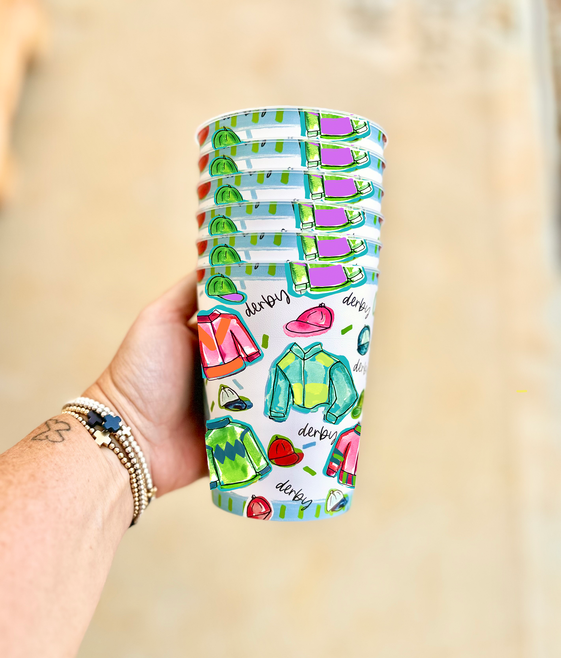 Bring these trendy and cute Derby Cups to your next derby party! You'll be the talk of the town! Our cups are sold in a set of 6 and are reusable! Dishwasher safe. Artwork features colorful polo attire!