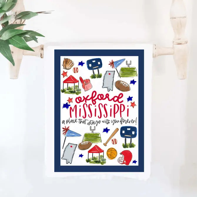 This towel features multi sport artwork: baseball, basketball, and football! Each towel contains original hand drawn artwork. Includes a hook on the back for easy hanging.